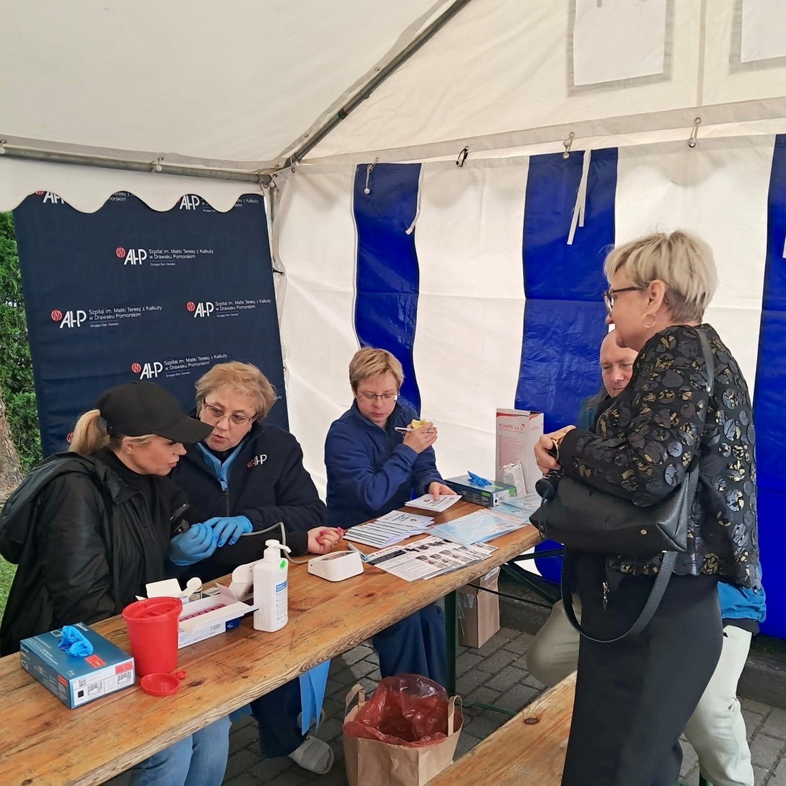 Na naszym stoisku, dzięki zaangażowaniu pielęgniarek i ratowników medycznych Szpital im. Matki Teresy z Kalkuty w Drawsku Pomorskim, odwiedzający mogli skorzystać z porad zdrowotnych oraz bezpłatnych badań przesiewowych.